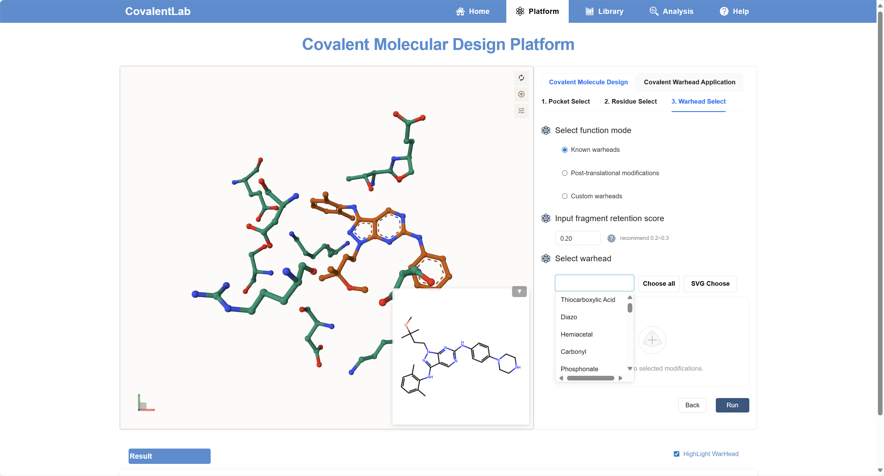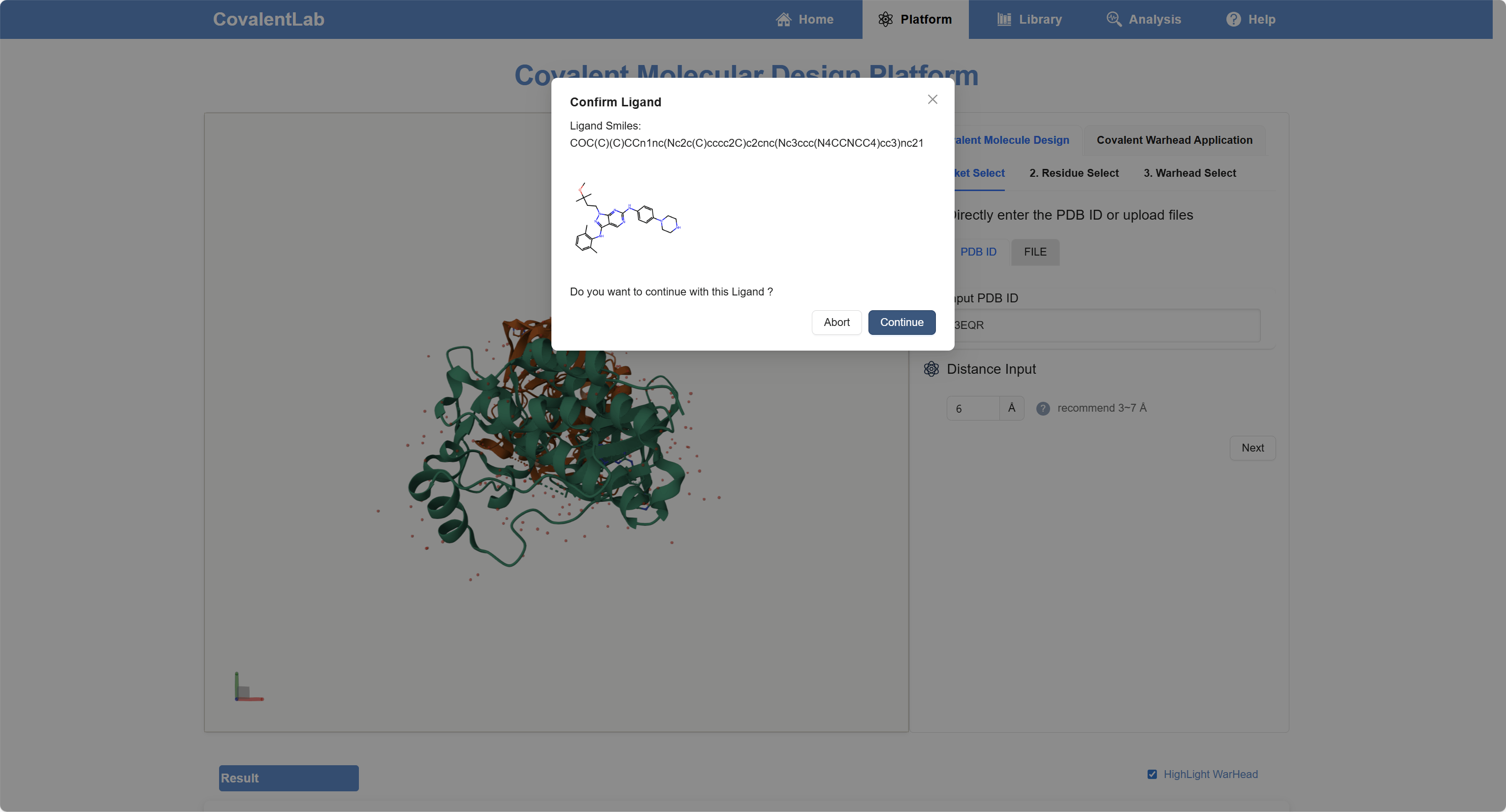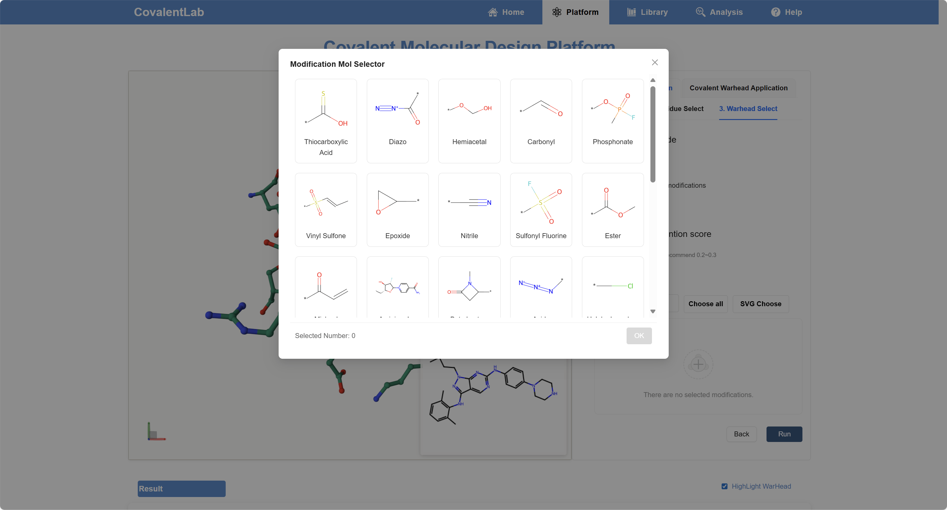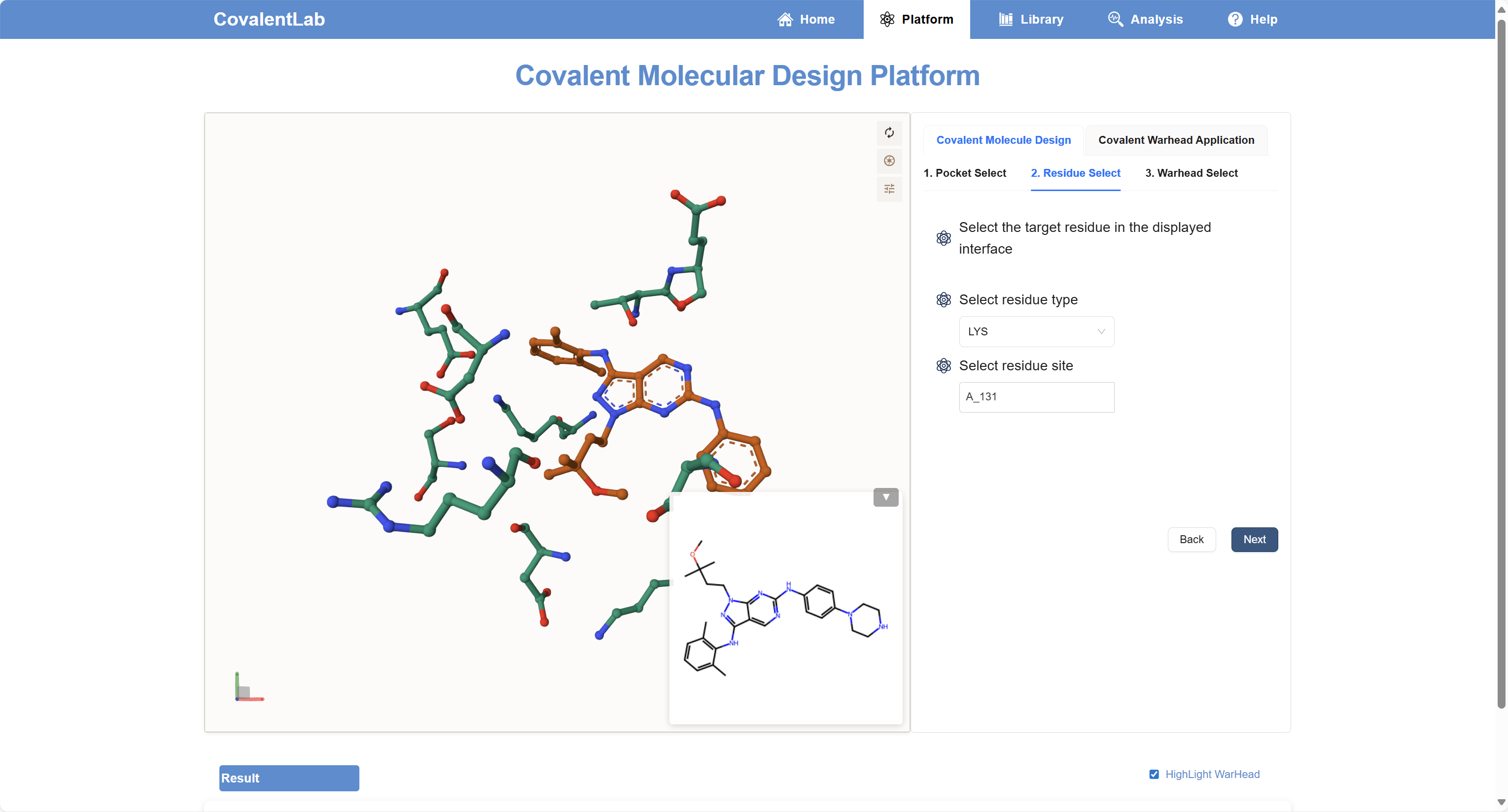 This section allows users to perform covalent molecule design for targets of interest. The process includes identifying amino acid residues near the target's binding pocket that are capable of forming covalent bonds, and then selecting the desired target residue. Subsequently, new covalent molecules were generated based on either the existing covalent warheads provided by the system or by uploading custom warheads.
