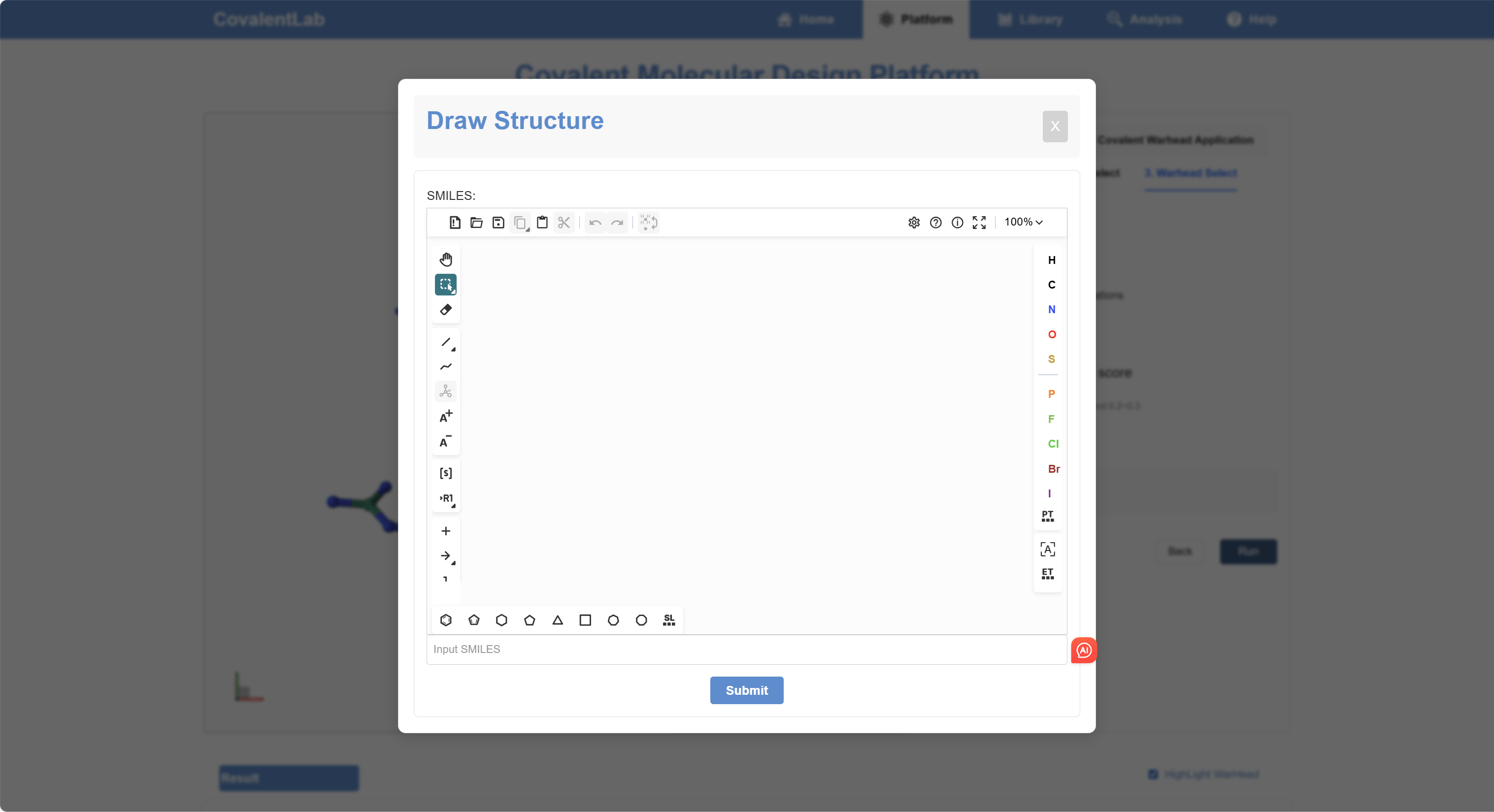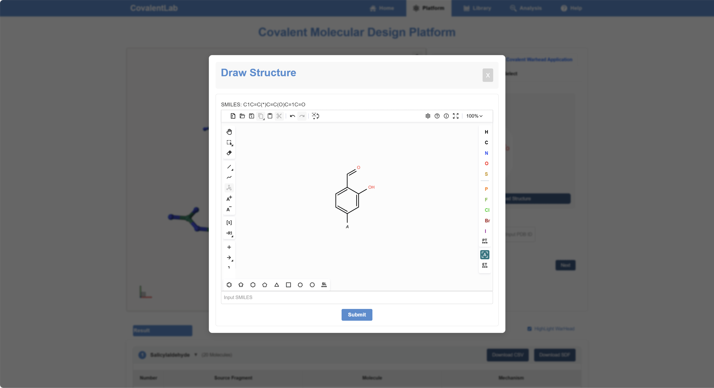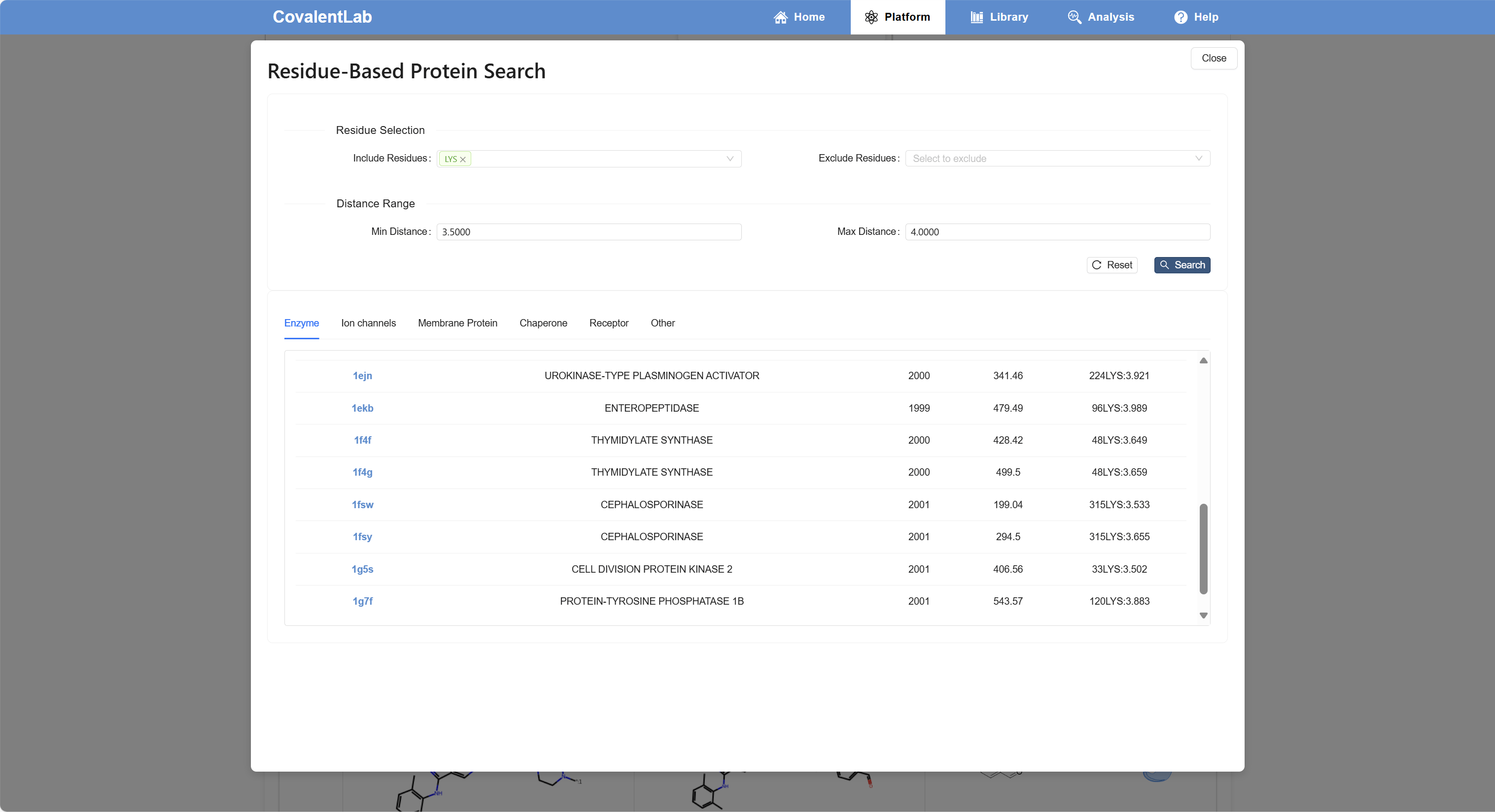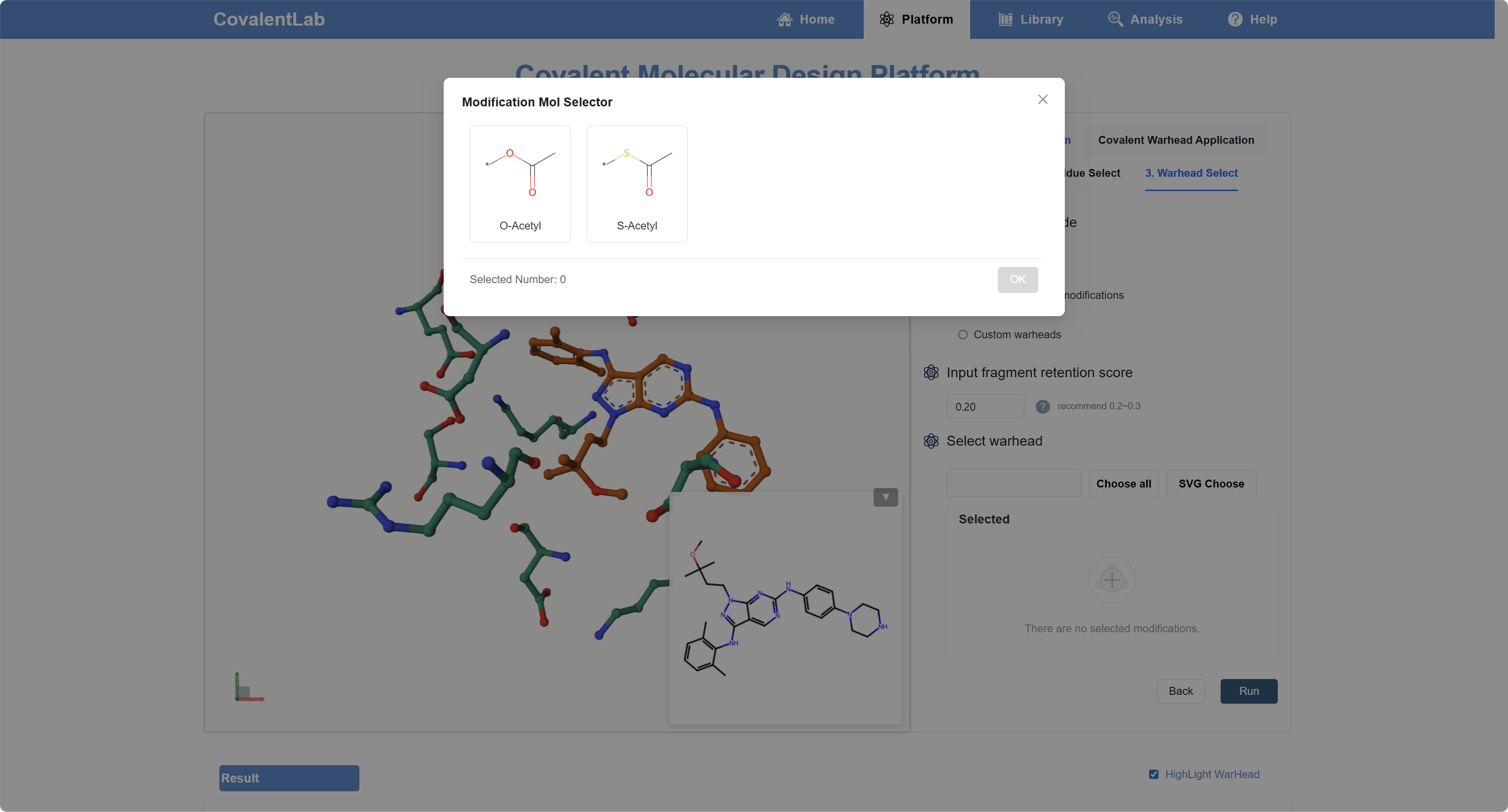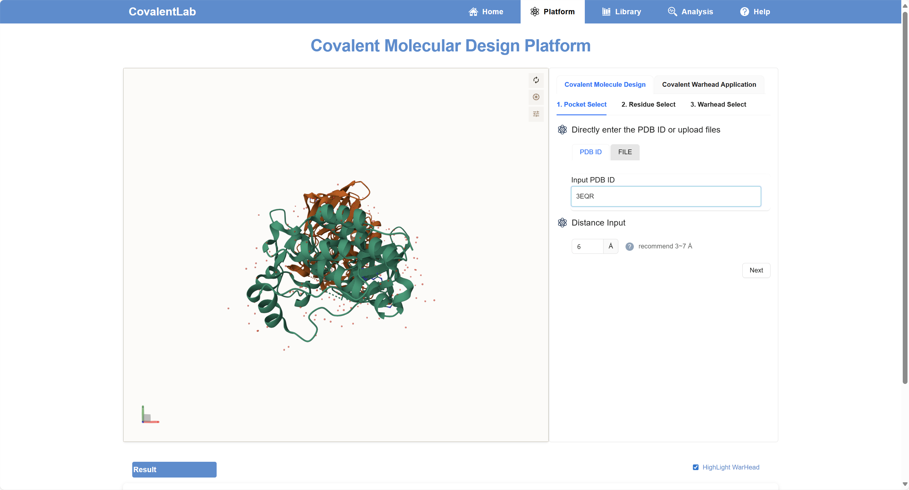 This section allows users to perform covalent molecule design for targets of interest. The process includes identifying amino acid residues near the target's binding pocket that are capable of forming covalent bonds, and then selecting the desired target residue. Subsequently, new covalent molecules were generated based on either the existing covalent warheads provided by the system or by uploading custom warheads.