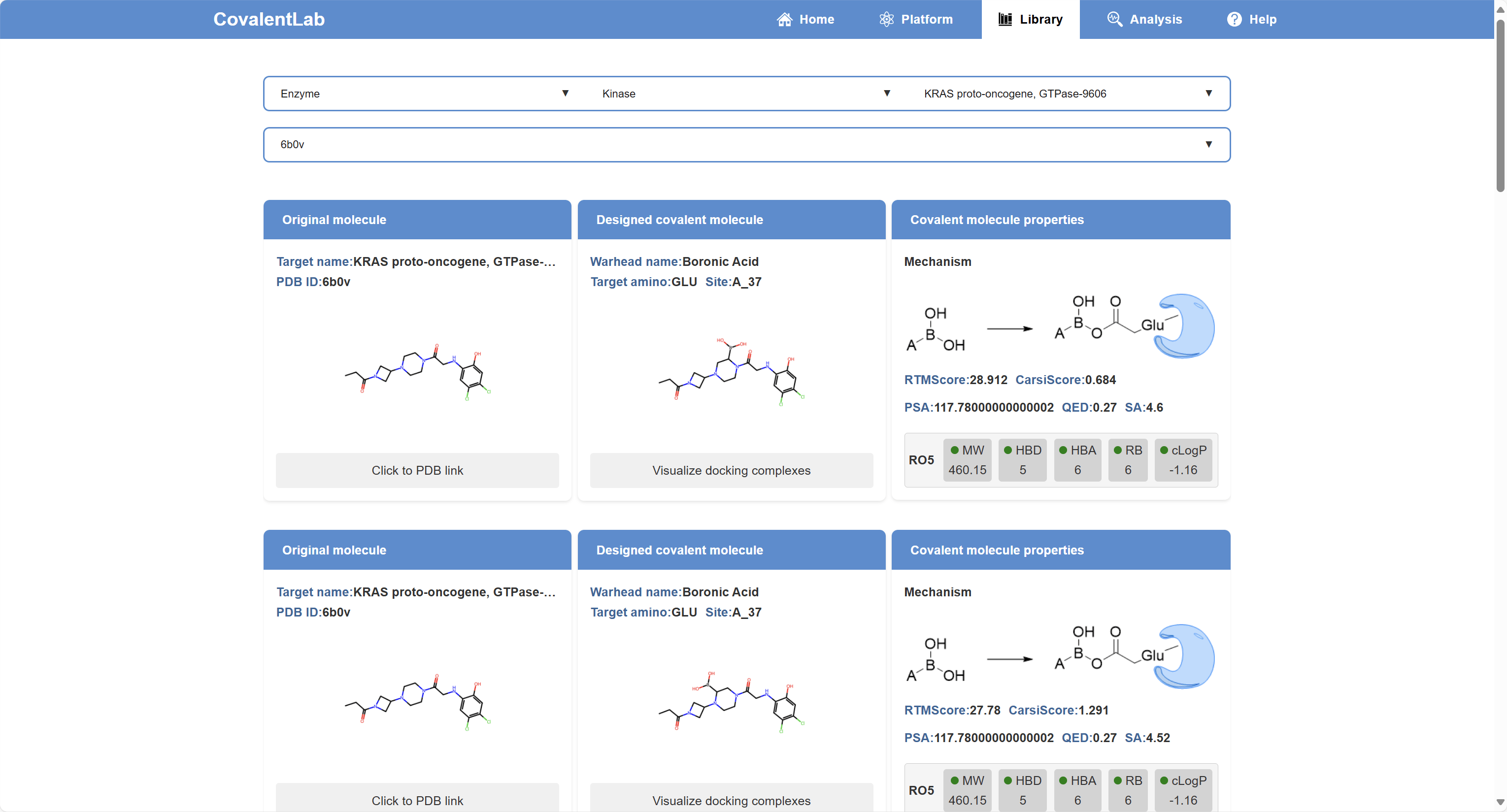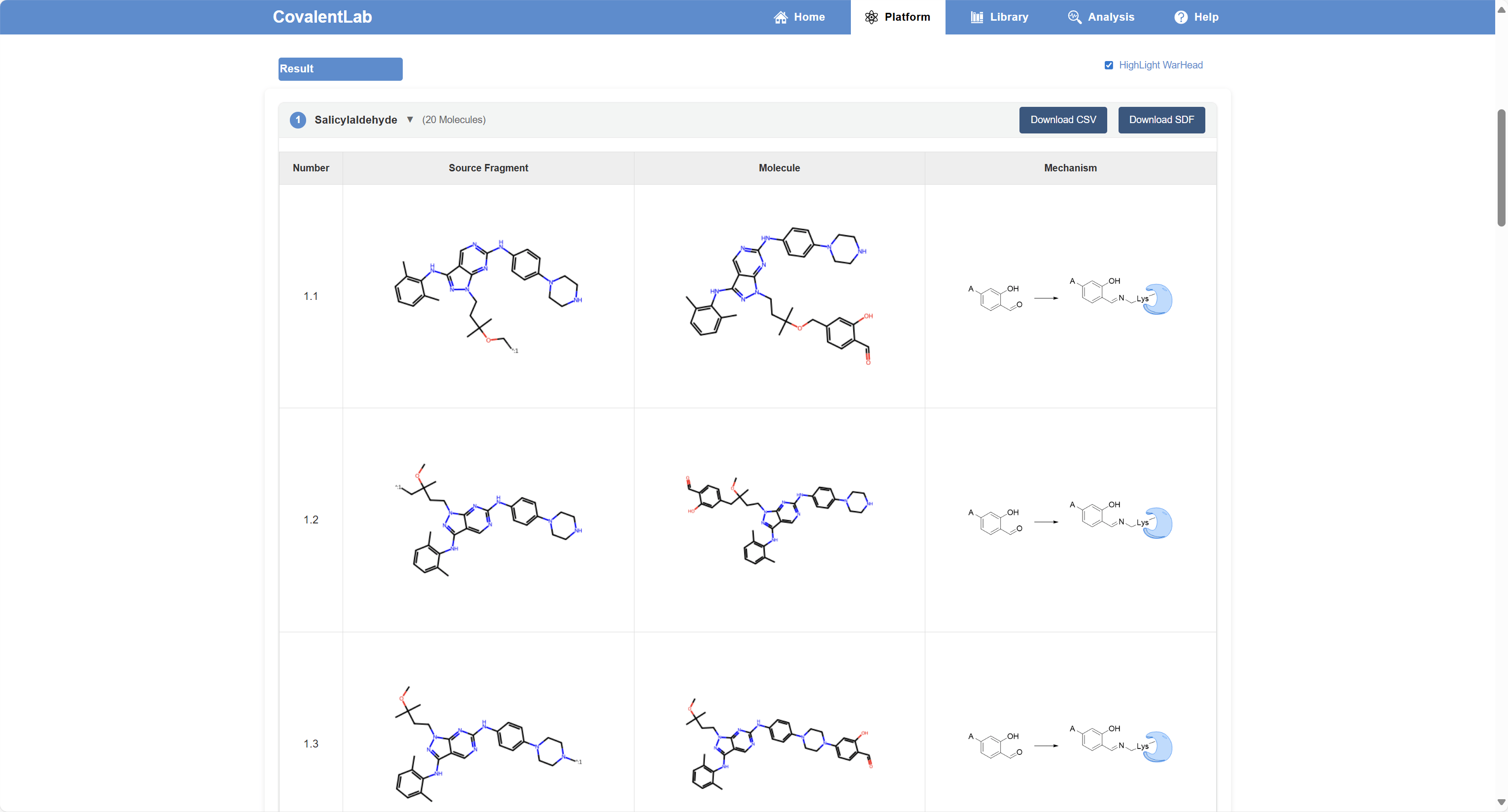 After completing warhead selection through any of these methods, the system will display the newly designed covalent molecule structure on the results page. Taking the covalent molecules generated from system-provided warheads as an example, the results page displays three columns of key information: